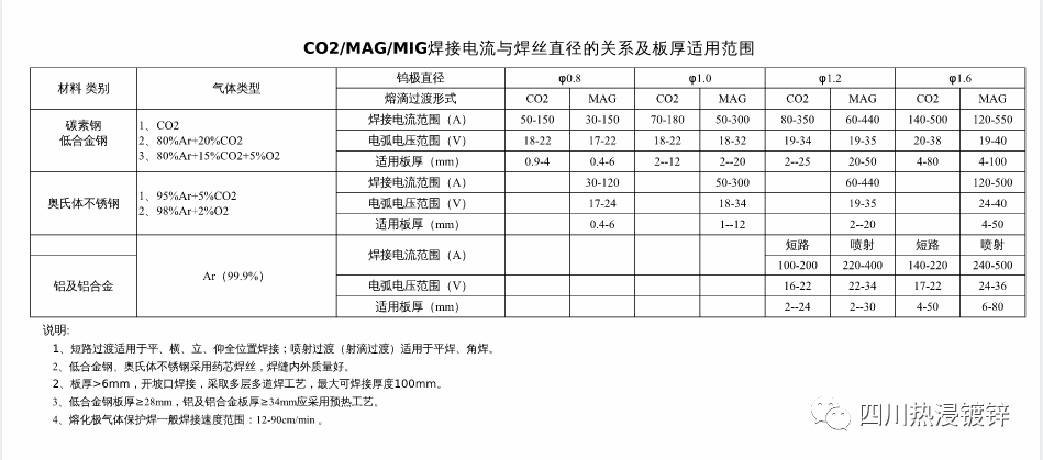 4、熱鍍鋅鋼構(gòu)件的氣體保護(hù)焊接一般為細(xì)絲,采用MAG焊接Ar+CO2焊接工藝,具體工藝參數(shù)見(jiàn)下表: